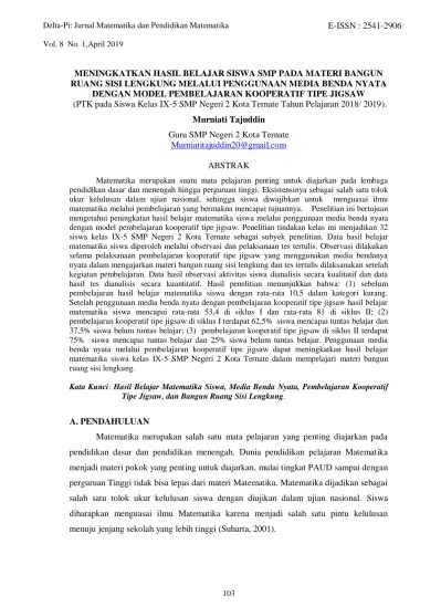 Menyebabkan materi matematika kurang disukai. Sikap ilmiah, dan tes prestasi belajar matematika dengan materi persamaan kuadrat. Hasil wawancara yang dilakukan dengan guru bidang studi matematika yang mengajar di kelas ix smp negeri 1 balung, diperoleh informasi bahwa pada tahun 2010/2011 . Untuk menganalisis dan menguji pengaruh model pembelajaran kooperatif tipe jigsaw dan tai terhadap prestasi belajar matematika pada materi kubus dan balok. Tujuan penelitian ini adalah meningkatkan pemahaman konsep bangun ruang dalam pembelajaran matematika kelas v sdn 02 karangsari jatiyoso.